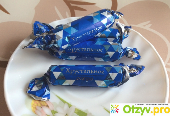 Дизайн упаковки очень и очень скромный. Он выполнен в красивых глубоких синих цветах, что в общем-то говорит о небольшой цене данных конфет. На упаковке представлено только название конфет «Хрустальное озеро», больше нет ничего. К сожалению производитель не оставил информацию о составе, информацию о себе, а также сроках хранения.