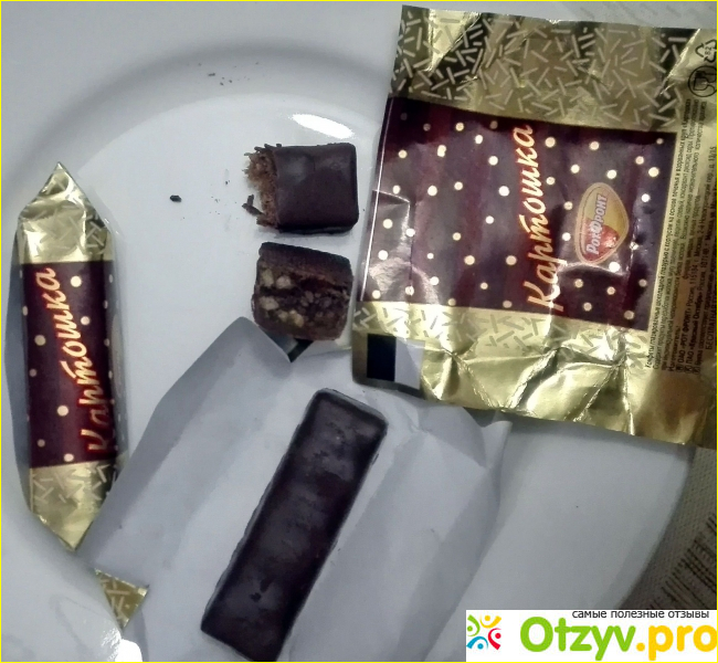 Я-то думала, что начинка этих конфет как у той самой пироженки-"картошки": насыщенная, тяжелая, но мягкая. А тут густая, плотно-тягучая, прилипающая к зубам масса, как у некоторых сортов ирисок.