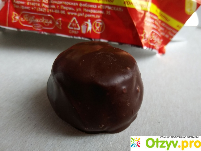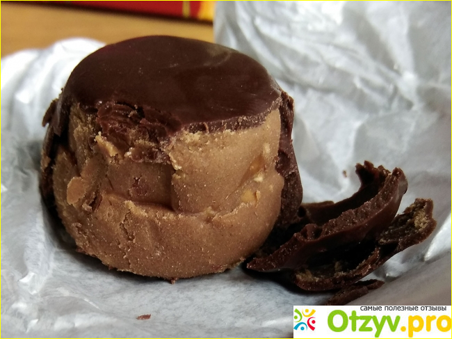 Аромат ореховый. Глазурь миллиметра 2, плюс, минус, имеет привкус горького шоколада. Правда, это немного не вяжется с консистенцией самой глазури, не похожей на шоколад. Но вкус не плох. Корпус конфеты светло-коричневый, как густая паста, можно сказать, что помадка.