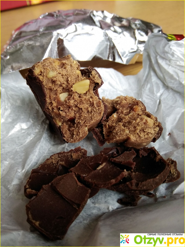 Но почему-то все конфетки имеют ступеньку. Такое впечатление, что шайбу меньшего диаметра положили на большую. Кусается мягко, хоть из холодильника, хоть в доме лежала. Внутри много крупных кусочков арахиса.