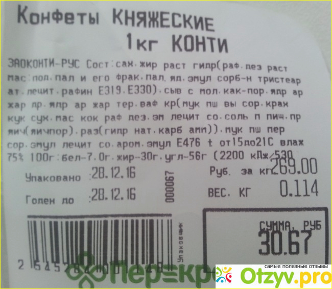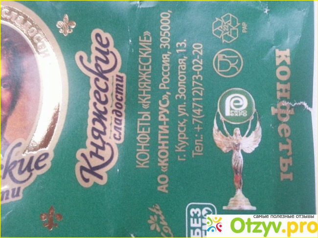 Люблю покупать конфеты в "Перекрестке": здесь всегда на этикетке есть полное описание состава. Вот эти конфеты - "Княжеские сладости" АО "Конти-Рус" я тоже покупала в "Перекрестке".