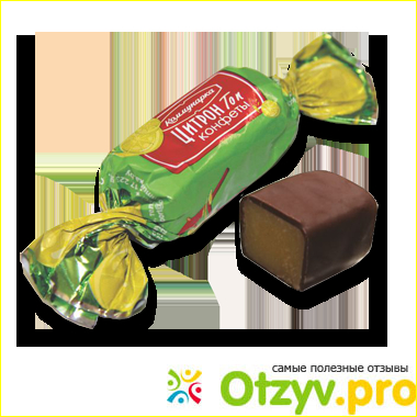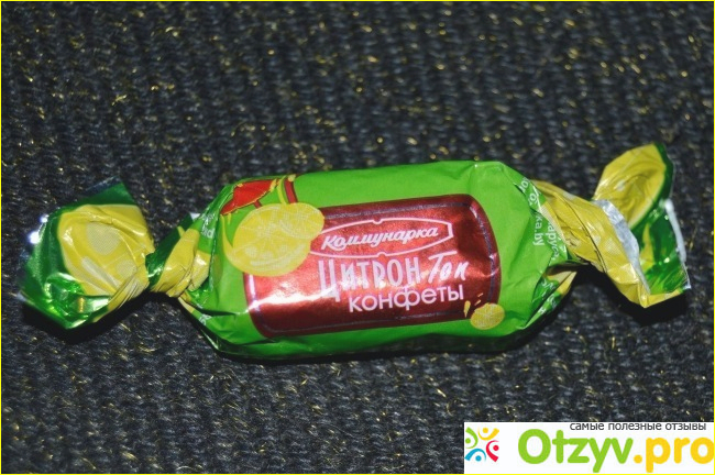 Здравствуйте, дорогие друзья. Эта конфетка в зелёной обложке с рисунком лимона говорит о своей принадлежности к лимонному виду. Под обложкой полная классика прямоугольной конфетки с лёгкими морщинками в глазури.