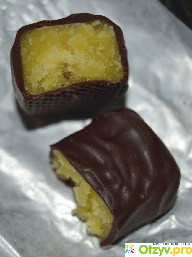 А вот начинка порадовала. Кисло-сладкая с приятным лимонным послевкусием. Не лимонный кислоты, а именно лимончика. Легко растирается во рту. Я бы одну начинку из этой конфетки ела. Эта кислинка не даёт конфетке быть приторной не смотря на всю свою сладость. А глазурь только всё портит.