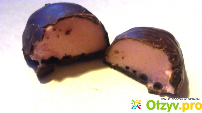 Конфетка овальной формы, выпуклая сверху и плоская снизу. Покрыта тонким слоем шоколада.