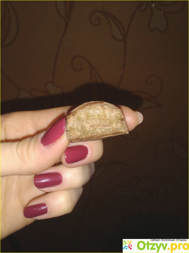 А вот как выглядит сама конфетка без упаковки. Небольшая круглая по размеру карамельная конфетка покрыта достаточно плотным слоем глазури из нормального молочного шоколада. И хоть я, признаться честно, не являюсь поклонницей молочного шоколада, предпочитая данному виду шоколада тёмный с высоким содержанием какао-продуктов, всё же не могу не заметить, что здесь, в этой конфетке, молочный шоколад глазури очень даже хорошо сочетается с основным содержимым данного десертного продукта.