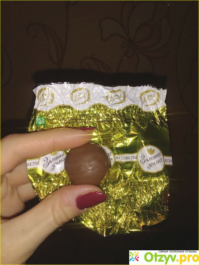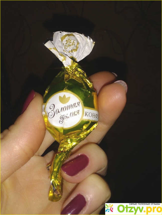 Эти небольшие по своему размеру конфетки называются очень эффектно - "Золотая лилия". Обёртки конфеток вполне соответствуют названию - выполнены они, что называется, простенько и со вкусом. Обычная блестящая фольгированная бумажка в золотисто-белой цветовой гамме. Смотрится несмотря на свою простоту очень даже привлекательно и эффектно.