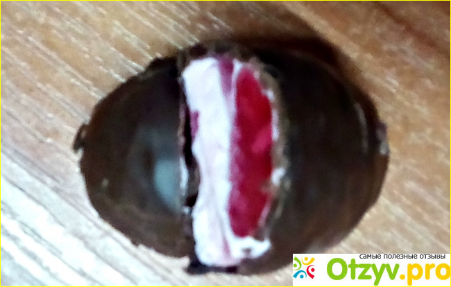 Начинка двухсложная, я такие начинки люблю. Половина начинки- желе со вкусом клубники. Вторая половина - суфле со вкусом сливок.