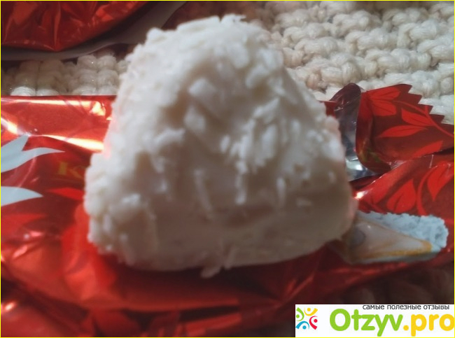 Внутри конфеты находится шарик из хрустящей вафли, вместо орешка. Да и вкус начинки отличается от конфет "Рафаэлло" . Начинка не такая нежная, зато и не такая приторно-сладкая.