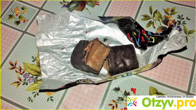 Далее последнюю одну третью часть оно почему-то решило сбросить скорость все это наглядно продемонстрировано на фотографии. Этот факт говорит о том, что конфета свежая и уровень содержания жидкости находится в норме. Было бы совсем неприятно если оно таким не является и лезвие тупо раскололо батончик.