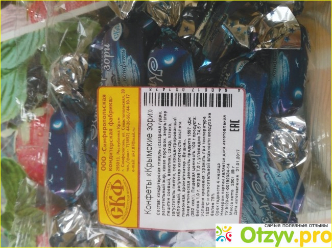 В составе есть пектин и какао порошок. Срок годности конфет 4 месяца, поэтому при покупке нужно обращать внимание на дату изготовления. Эти конфеты не стоит покупать летом на уличных распродажах, так как в Крыму в этот период 30 градусов тепла и жарче, а их нужно хранить по рекомендации самого производителя при температуре не превышающей 23 градуса тепла.