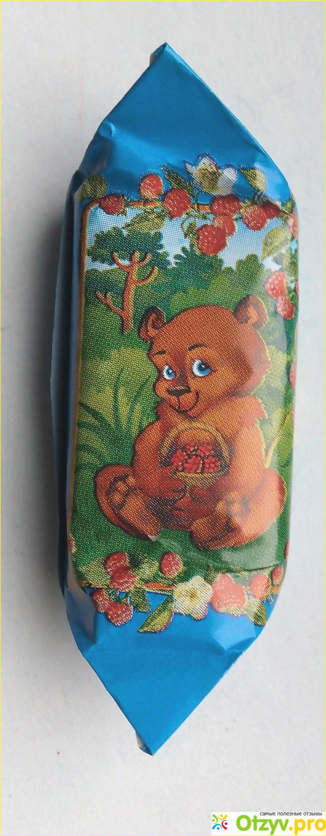 На конфете изображён милый медвежонок с корзиной малины, он так нежно скромно смотрит, так и хочется взять в руки.