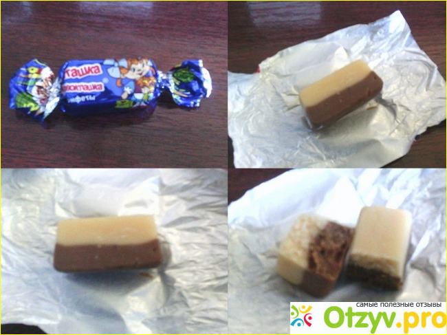 Аромат молочный. Белая (немного желтоватая) половинка сверху, она уже. Это типичная «школьная», очень сладкая со сливочно-моолочным вкусом. Нижняя часть с какао уже повеселее. Вкус действительно насыщенный, на сколько может быть насыщенной помадная конфетка. И не так сильно сладко. Вместе получается не плохо. Сладость сглаживается, но и насыщенность немного уходит.