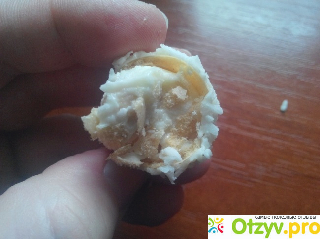 Вот о чём я так вкусно рассказываю. Посмотрите на начинку конфеты Raffaello, очень интересно перемешан белый крем с хрустящей начинкой.