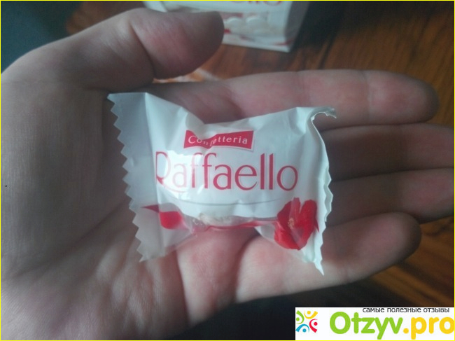 А так конфета Raffaelo выглядит непосредственно перед употреблением! Такая нежная и аппетитная конфета, с хрустящей начинкой внутри, не оставит вас равнодушными))).