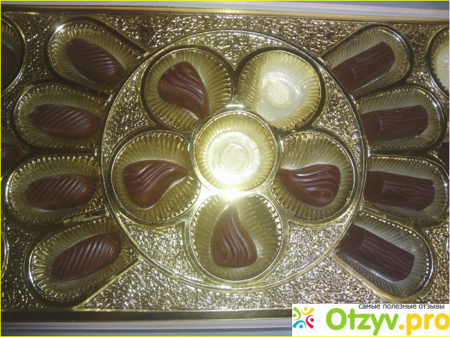 Коробка конфет достаточно большая и подходит в качестве небольшого презента на праздник. Все конфетки аккуратные - одна к одной. Все сложены на золотистой форме и сверху покрыты защитной пористой бумагой.