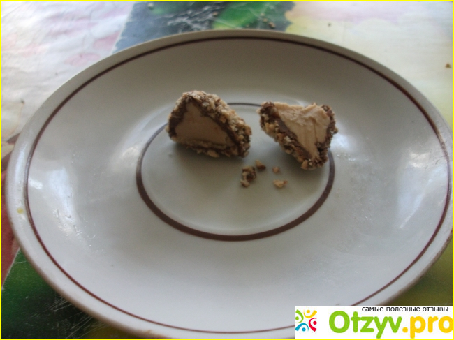 Снаружи- слой кондитерской глазури, местами потрескавшийся, ("обезжиренное" какао - его масло пойдет в настоящий шоколад, сахар простой и жжёный для цвета, и пальмовое масло), обсыпанный вафельной крошкой, (осыпается). Начинка - орешек арахиса в полужидкой смеси одеколона, (ароматизаторы), сахара и кокосового масла. Вкус? Описать словами трудно, но на мой взгляд, даже простенькая Сормовская "Ромашка" куда вкуснее.