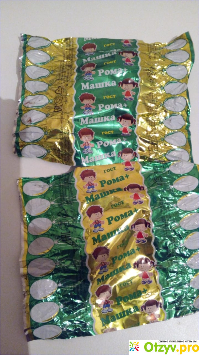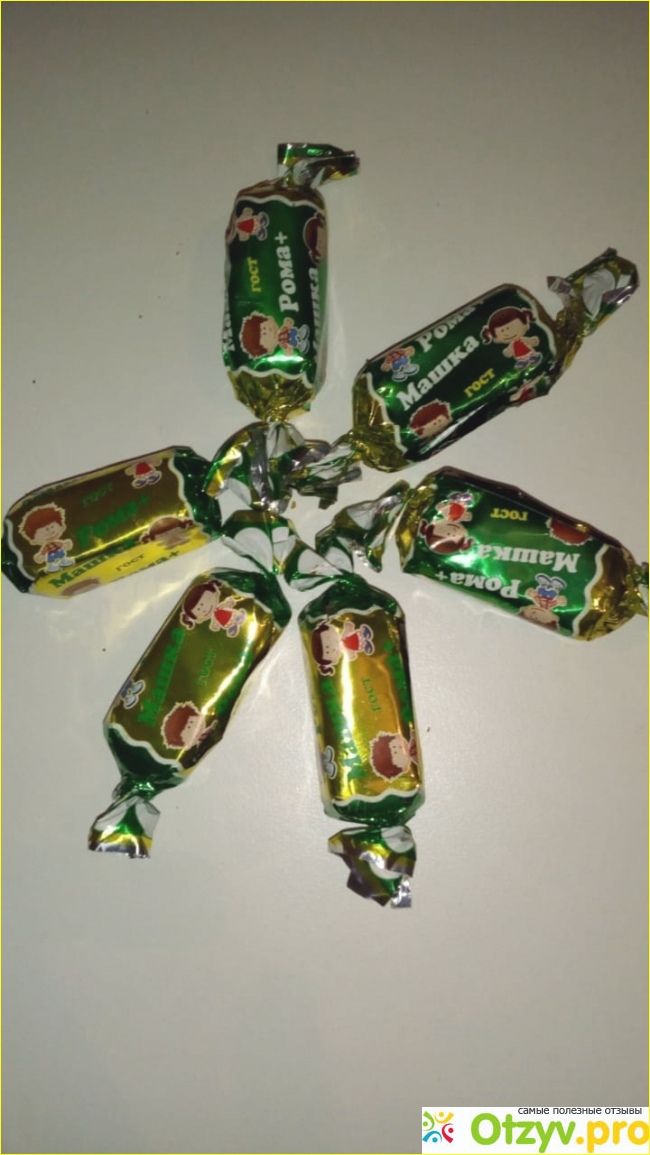 Конфеты "Рома + Машка" в ярких зеленых фантиках из фольгированной бумаги с надписью. Внутри обернуты в фольгу.