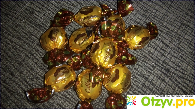 Обертка очень красочная, привлекающая внимание. На ней название конфет, логотип фирмы, ну и конечно же зерна кофе.