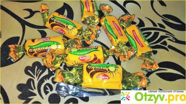Оформление фантика данных конфет действительно очень приятное и полностью соответствует своему содержимому потому что "Солнышко" как-то ассоциируется именно с растением подсолнух, а в названии под солнышком на зеленом фоне видим слово "семечки", то есть "с семечками".