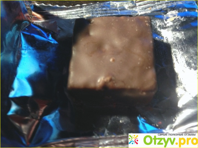Фантик не яркий, но привлекает взгляд, в сиренево-коричневых тонах. А коли торговая марка носит название "Шоколадно", то ожидаемо, что конфеты будут в шоколаде. Но нет и я это сразу знала, потому что конфеты не дорогие. Стоят они 85 гривен за килограмм, потому конфетки в шоколадной глазури. Конфеты квадратной формы и покрыты глазурью со всех сторон.