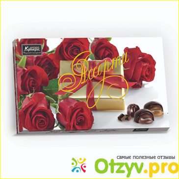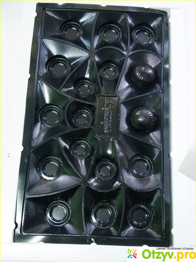 Эту коробку конфет подарил на работе начальник на наш небольшой женский коллектив из пяти человек. В коробке оказалось 17 конфет (5 маленьких и 12 покрупнее), мы поделили их по три штуки. Две крупные «дежурные» конфетки остались.