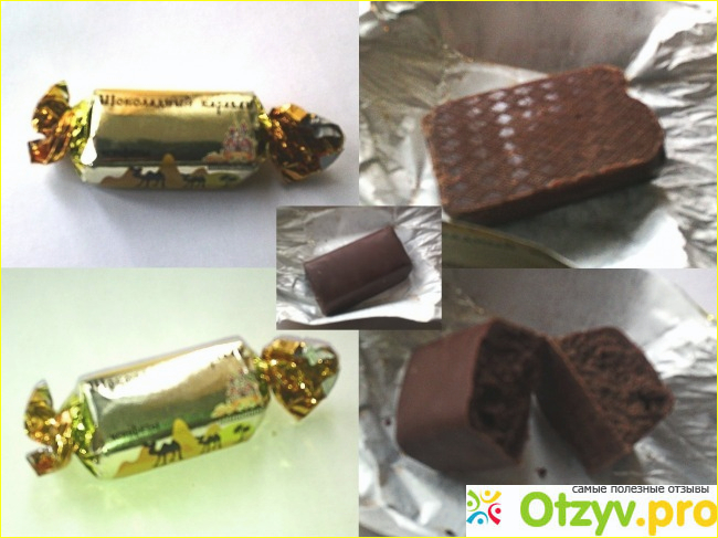 Обложка этих конфет удивительно красивая, золотая: в центре светлая, почти зеркальная, у краям темнее. Она тёмная , гладенькая и приятно пахнет. Похоже на шоколад. Разлому поддалась легко. Внутри она оказалась ещё темнее, чем её глазурь. Структура плотная. При рассасывании – очень сладкая, вроде как и чувствуется какао, но что-то его забивает. Похоже на ванилин. А потому получаются немного разные ощущения от того, быстро или медленно её кушать. Во рту расплывается, но не сразу. Вафельную крошку, оказанную в составе слышно крайне неуверенно. И для этого конфетку нужно грызть.