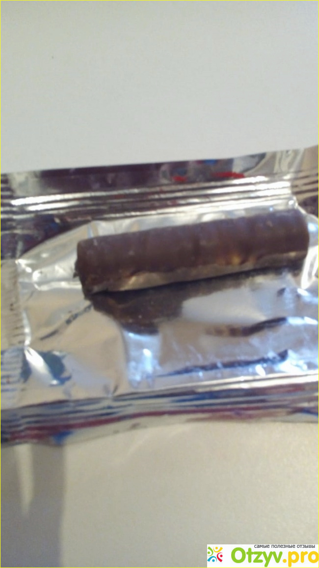 А вот развернутая конфета, состоящая из хрустящей вафельной трубочки покрытой темной шоколадной глазурью, а внутри под вафельным слоем шоколадная начинка со вкусом трюфеля.