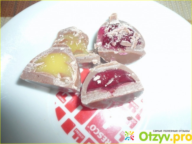 Слой шоколада довольно толстый, не мнется. Но при разрезе ножом слегка крошится, что нормально, так как он и должен быть хрупким, а не размазней. На срезе выглядит несколько странно, это потому, что я разрезала ножом-пилочкой. Начинка вишневая красного цвета, яичная бледно-желтоватая. И довольно жидкой консистенции. Эта особенность для меня неоднозначна. И хорошо, и не совсем. Об этом ниже.
