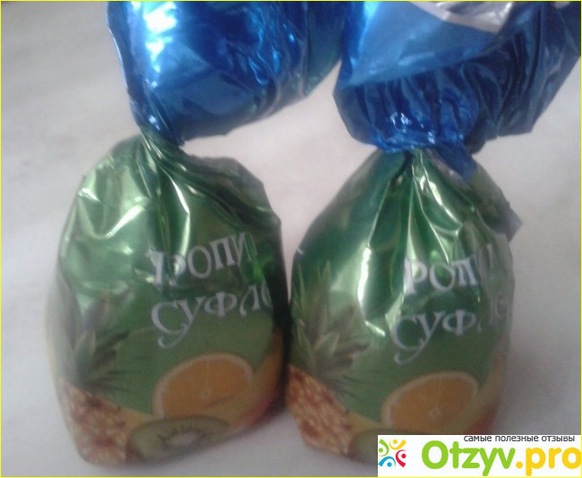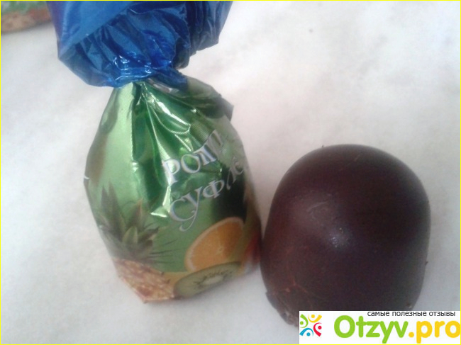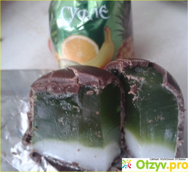 Здесь все на высшем уровне. Суфлейный слой белого цвета очень нежный и вкусный, сливочный, судя по всему, а второй слой- зеленого цвета- это желе из фруктов тропических. Но только вкус тропических фруктов не очень ярко выраженный, приглушенный, я бы сказала, но зато нет огромного количества сахара, который часто вбухивают в начинку конфет подобного рода. И потому эти конфеты кажутся особенно нежными и вкусными. Всем их рекомендую попробовать.