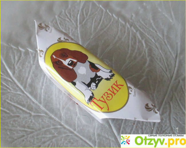 На фантике нарисован симпатичный пёсик, написано название.