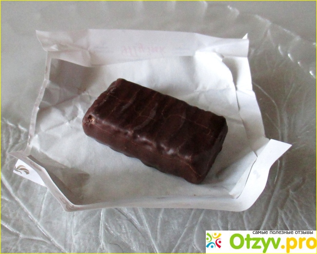 Конфета покрыта шоколадной глазурью. Это мягкий шоколад, тающий в руках, в меру сладкий, вкусный.