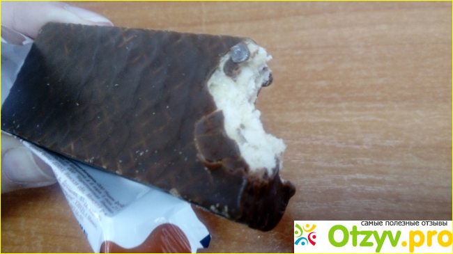 Сверху конфета покрыта молочной шоколадной глазурью. Слой глазури тонкий, но она очень вкусная и нежная, не сухая и не осыпается.