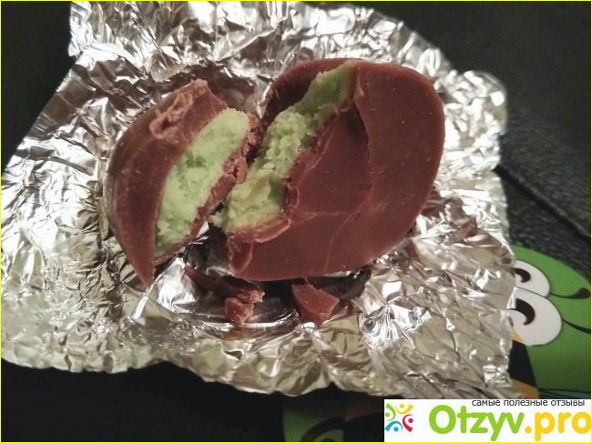 Начинка зелёная пастообразная, очень мягкая и сладкая, слаже глазури. Конфеты были из холодильника, но в комнате мгновенно стали мягкими. Хватило времени пока я им фотосессию провела. Я их точно больше брать не буду.