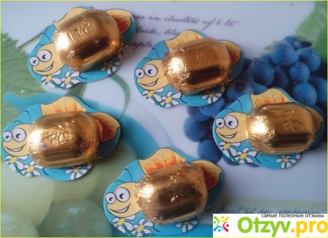 Задумка реально очень интересная. Небольшая конфетка в золотистой фольге прикреплена на подложку. На подложке изображена пчелка. Маленькие дети с такой конфетой даже поиграть могут, перед тем как ее скушать. Конфета легко отделяется от подложки. Очень редко при этом фольга может слегка порваться, но это не критично.
