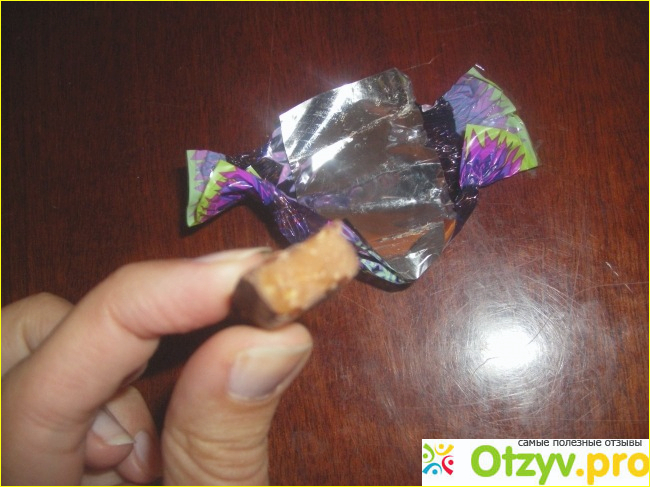 Очень яркое оформление обертки у этих конфет. Здесь использованы темно-сиреневый, фиолетовый, салатовый, розовый. Приметная обертка, запоминающаяся. Да и название написано крупными буквами. Обертка состоит из полиэтиленовой обертки и внутри еще есть обертка из фольги. Обертка у конфет шуршит, поэтому "худеть" по ночам этими конфетами не получится)