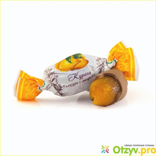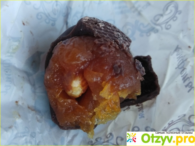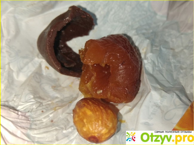 Внутри целое зёрнышко миндаля. Его вкус теряется в абрикосе. Как сладость, десерт хорошо. Но для меня конфеты это прежде всего шоколад, а не фрукты, печенье или вафли.