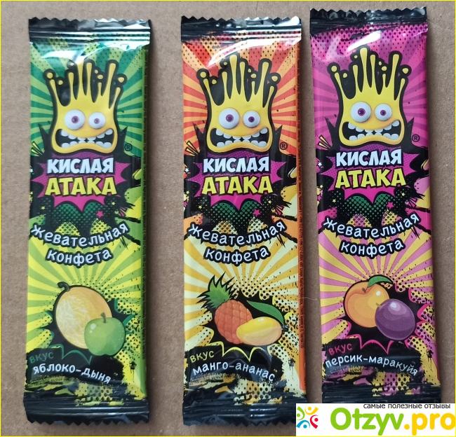 Конфеты жевательные "Кислая атака" со вкусами манго-ананас, яблоко-дыня, персик-маракуйя непременно понравятся любителям сочного и кислого.