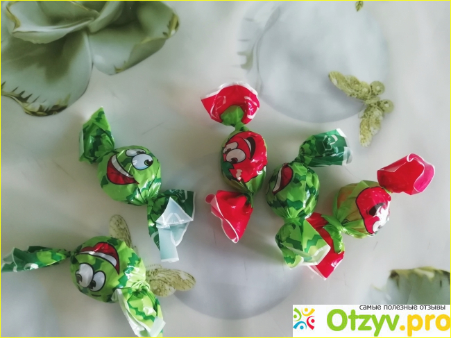 Цвет в зависимости от вкуса: арбуз-зеленый, зеленый и красный-клубника со сливками, желтый-дыня. Когда выкладываешь сразу все конфеты в вазочку, то в ней сразу играет прекрасная цветовая радуга.