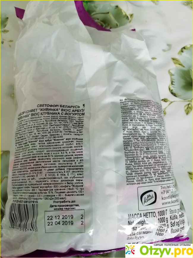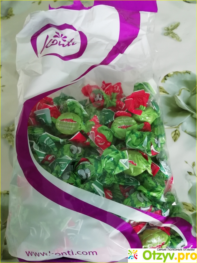 Единственный минус упаковки-не все вкусы собраны. Арбуз совмещается с клубникой со сливками, вкус дыни ни с кем не скомпоновали, он сам по себе. Мы иногда чередуем: месяц одну упаковку, месяц другую. Но, когда ждем дома много гостей, берем сразу все. Ведь еще не один гость не остался равнодушным к мармеладной конфетке.