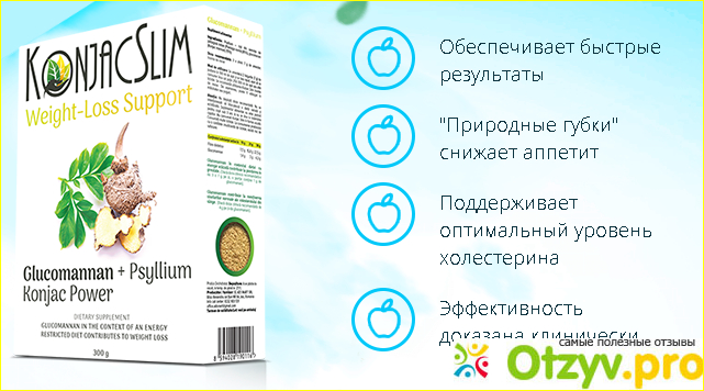 Препарат Konjac Slim особенный, так как он конкретно берет под контроль аппетит. Ну а, как известно, уменьшение поступления калорий приводит к тому, что начинают расходоваться запасенные жиры. Кроме того состав помогает понизить содержание холестерина и вы убережете себя от многих заболеваний связанных с этим соединением, таких как варикоз, тромбоз, инфаркт, инсульт, атеросклероз. Выпускается добавка в виде порошка, который легко растворяется в воде.