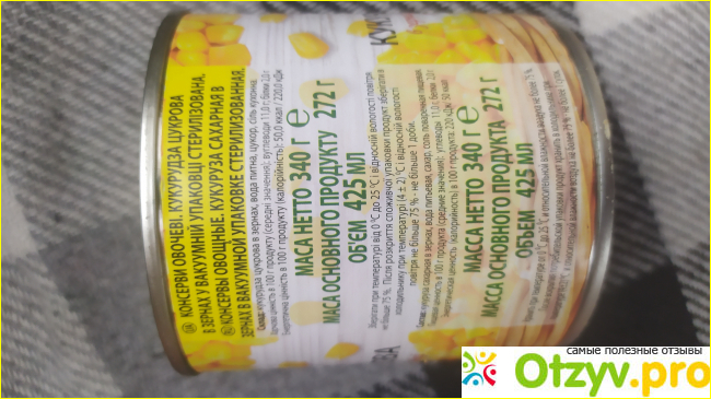 Вес всего содержимого банки 425 грамм, а непосредственно кукурузы 340 грамм.