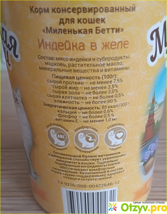 Изготовлен консервированный корм для кошек "Миленкая Бетти" на ООО "Елецкий мясокомбинат", Россия, г. Елец. В нашем "Светофоре" стоимость банки с кормом массой 415 грамм составляет 27, 90 руб.