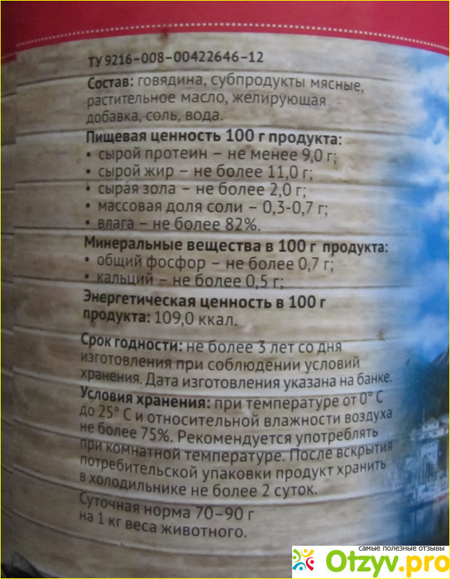 Как видим, состав очень даже не плохой - натуральный. Вскрытую банку рекомендуется хранить в холодильнике не более двух суток - это говорит о минимуме консервантов в составе. Консервированный корм производится согласно ТУ (техническим условиям), а это считается признаком хорошего качества продукции.