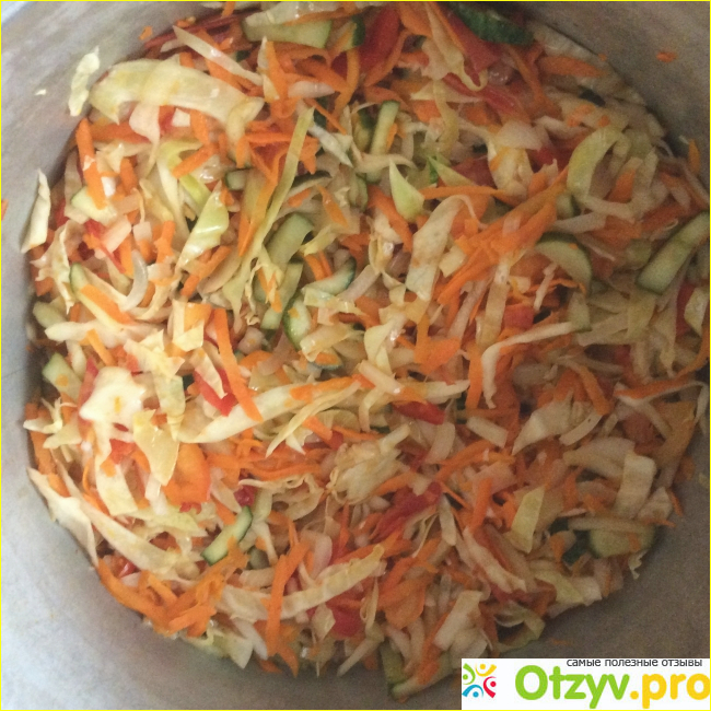 И ещё, я очень не люблю консервацию, которая требует стерилизации банок с продуктами, а этот салатик стерилизовать не требуется. Я сначала взяла для пробы и приготовила салат из половины порции, указанной в рецепте. Получилось три литровых баночки и немножко осталось. После пробы остатков, мы решили закрыть его ещё потому что салат получился очень вкусным и главное, овощи в нем тверденькие, не какая-то каша. Так вот, берём по килограмму помидор, огурцов, сладкого перца, лука, капусты и моркови. Все режем соломкой, морковь можно потереть. Затем перемешиваем в кастрюле и добавляем 5 чайных ложек соли, 5 столовых ложек сахара, 1стакан постного масла, 1 стакан уксуса. Все перемешиваем и оставляем на час, затем ставим на огонь и варим после закипания 7-10 минут, помешивая. Раскладываем по чистым банкам, закатываем и оставляем под шубой до утра. Получается 5-6 литров. Попробуйте - очень просто и вкусно.