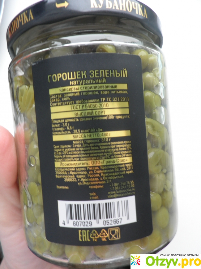 Неизменно для салата оливье я покупаю консервированный зелёный горошек "Кубаночка". Предпочитаю банки из стекла, дабы видеть содержимое перед покупкой. Заявленный высший сорт действительно соответствует содержимому внутри.