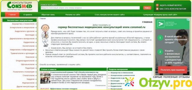 С левой стороны сайта размещены несколько наименований разделов. все они созданы по алфавиту. Вот например, я зашла в раздел на букву А и выбрала для себя Акушерство и гинекология. Увидела, что в он-лайн консультации участвуют 52 человека. задано вопросов около 5000 тысяч и получено ответов около 4000. Комментарии оставлял любой зарегистрированный пользователей и их было около 2000 тысяч. Затем выводилась средняя оценка ответов. И так это было в каждом разделе по бесплатной онлайн консультации. Проще некуда. Всё внятно и понятно.