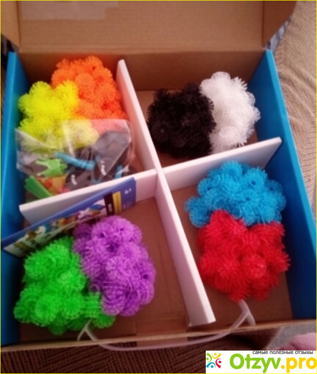 Конструктор был разделен по секторам, репейников каждого цвета примерно поровну, за исключением белого - его было всего 20 штук, и это не ошибка завода - такое количество указано и в инструкции. Дополнительно прилагались пластиковые детали в виде глаз, лапок, очков, усов и прочих завершающих образ вещей. Дополнительно шла инструкция с несколькими вариациями поделок и их краткому описанию.