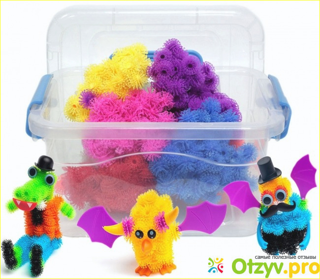 Это мягкий конструктор-липучка, а конкретнее - это набор разноцветных шариков от желтого и до синего, которые прилипают друг к другу по принципу репейника, потому что полностью со всех сторон у таких деталей есть что-то вроде шипов. Такие детали превращаются во множество различных цветных фигурок. Что мне нравится в таком наборе так это то, что есть еще и инструкция по выполнению этих фигурок и можно вместе с ребенком вместе творить каждый раз какую-то новую фигурку. Конструктор очень оригинальный и буквально затягивает всех от мала и до велика. Можно играть хоть всей семьей.