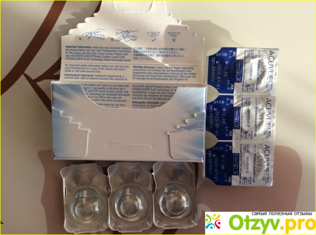 Дизайн упаковки линз очень приятный. Он выполнен в нежно-голубых и белых тонах. Эти линзы производится не в России, а в США. Именно поэтому вся необходимая информация находится на информационной наклейке, адаптированной для русского покупателя.