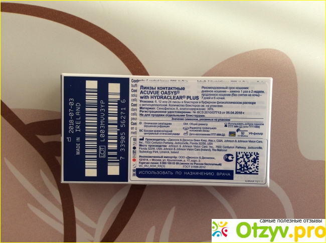 На упаковке указаны базовые признаки, характерные для моего зрения, общий диаметр, индикатор правильного расположения линзы, даты годности, все необходимые контактные данные производителя и импортёров в России. Также выделена надпись, что использовать их можно только по назначению врача.